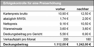 Um dies herauszufinden, hilft am besten eine testweise Preiserhöhung um 1 oder 2 Euro beim Lieblingsgericht der Gäste. In dieser Phase muss natürlich der Verkauf überwacht werden: Bestellen die Gäste noch genauso oft ihr Renner-Gericht? Hat sich der Deckungsbeitrag, der mit dem Gericht bisher erzielt wurde, erhöht? Um saisonale Einflüsse auszuschließen, sollten die Zahlen am besten mit dem entsprechenden Vorjahresmonat verglichen werden (siehe nebenstehende Kalkulationstabelle).